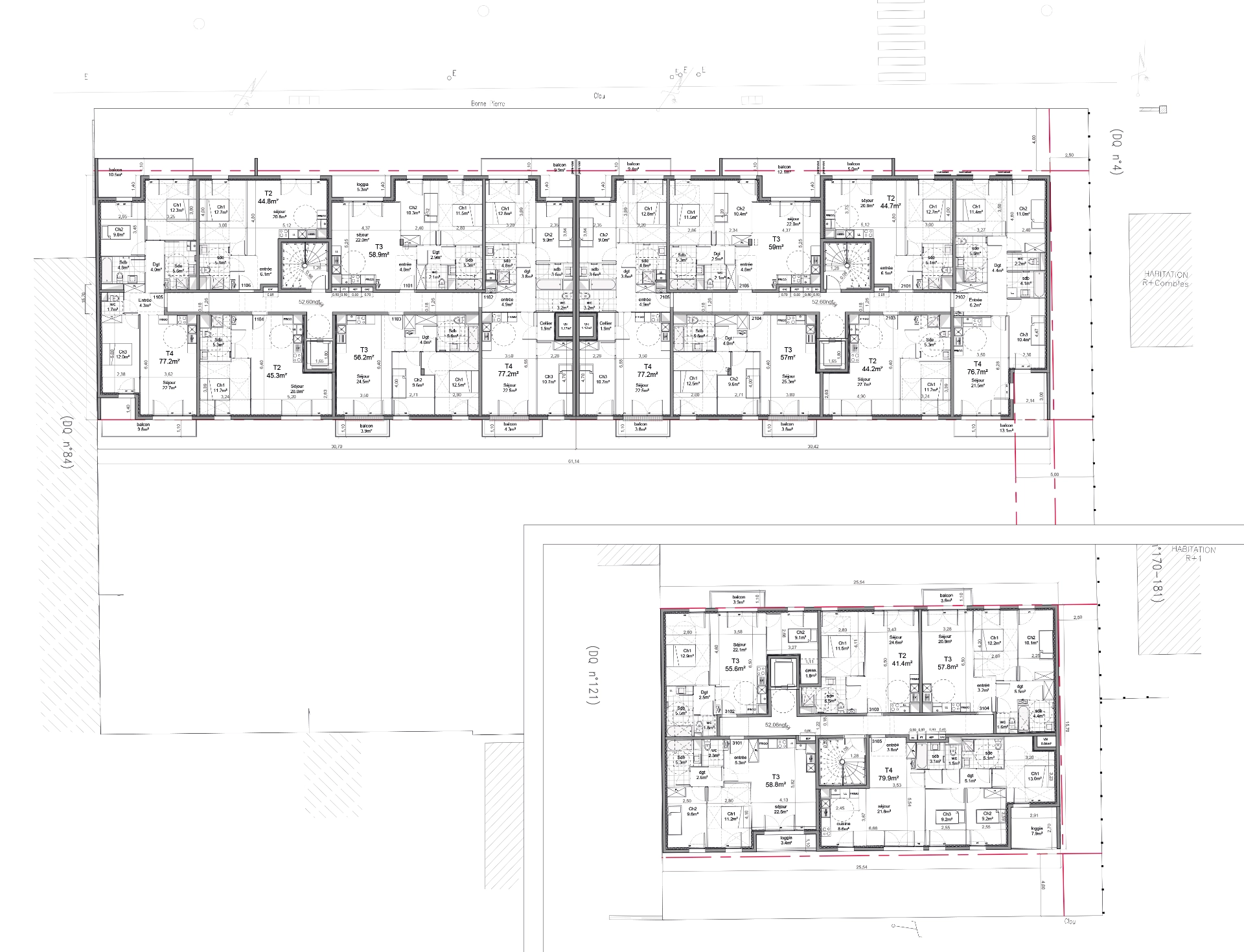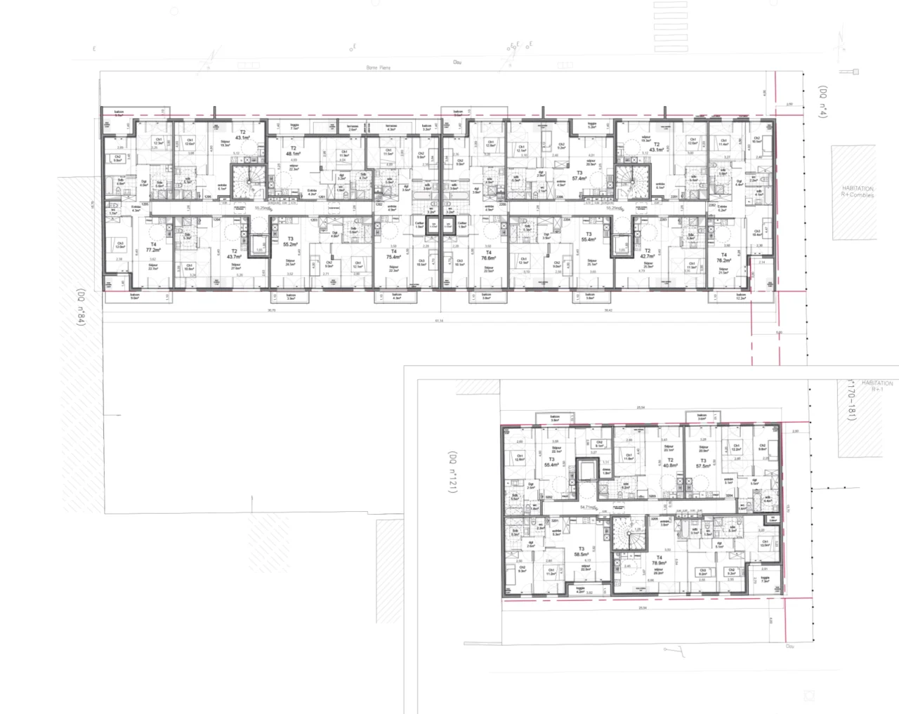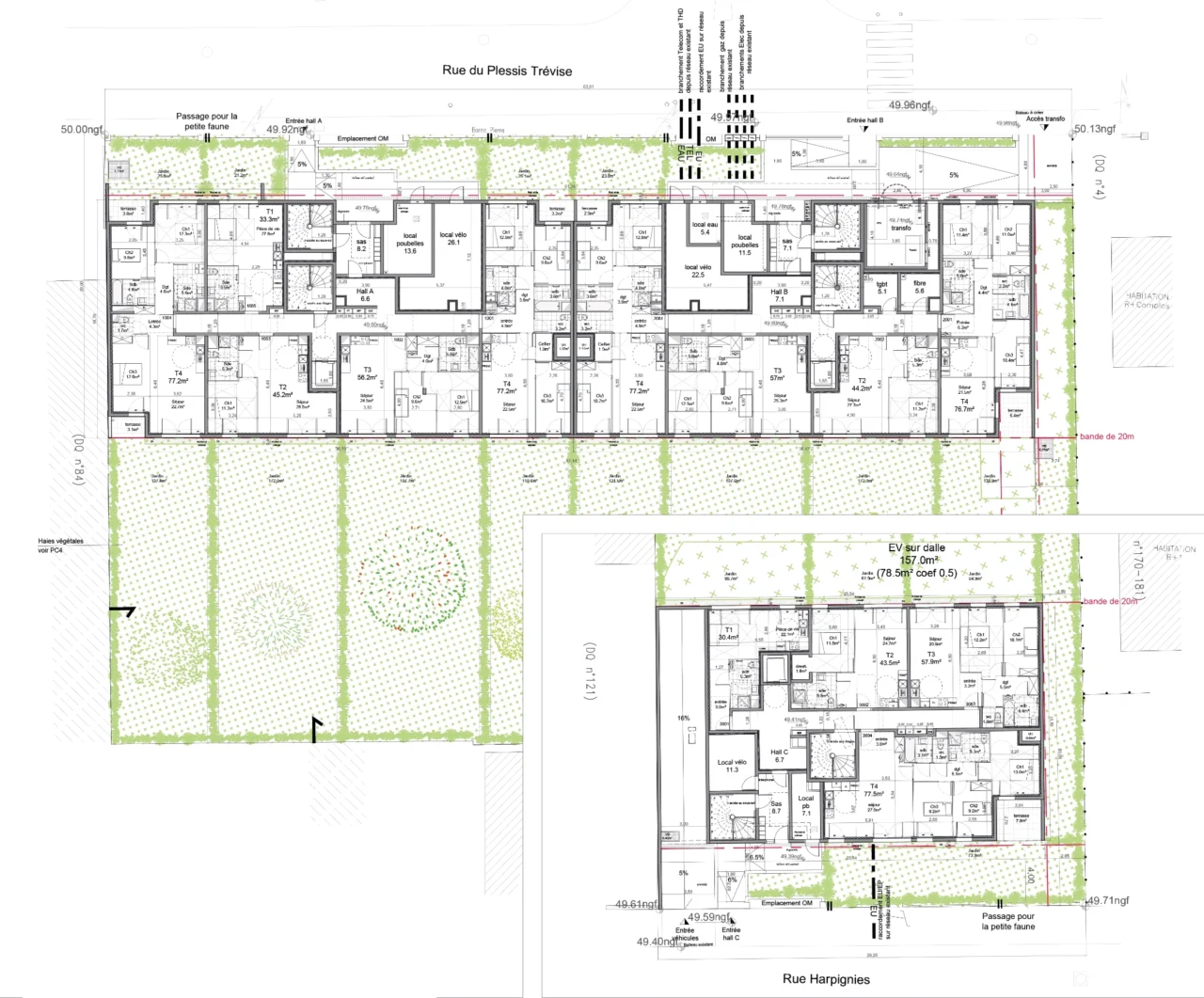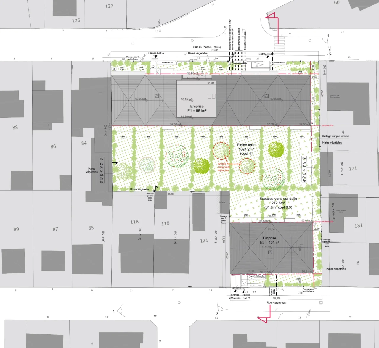 Le projet est composé de trois bâtiment. Deux d'entre eux composent le corps central sur rue. Le troisième est en front intérieur de parcelle, donnant sur une allée secondaire. Totalement indépendant en superstructure, il est relié au deux autres en infra par le biais d'un parking souterrain mutualisé.