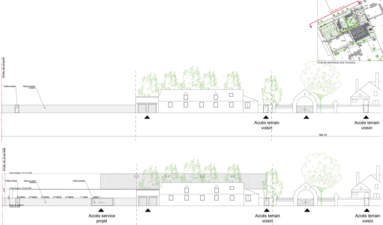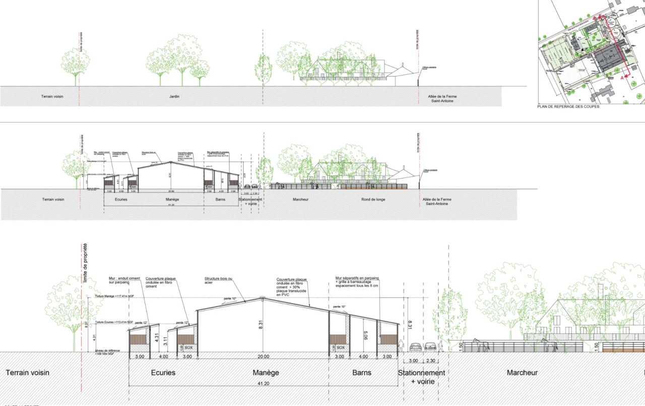 Centre Équestre Type Équipement public Lieu Le Plessis (95) Statut Livraison 2025-26 A venir Client A venir Programme A venir Architecte Alcyone Surface A venir Budget A venir Plans Plan repérage sol Plan RDC Coupes Façades