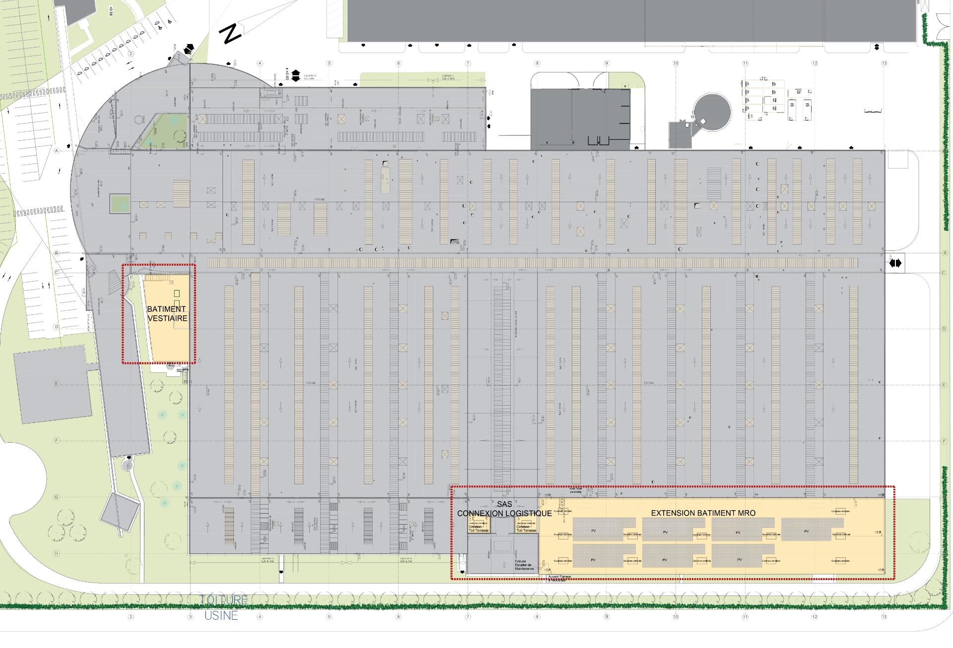 Le projet comprend l’extension d’un atelier process et la réhabilitation-extension des vestiaires, en forte croissance. Visible depuis l’espace public, cette extension devient la nouvelle façade du site.