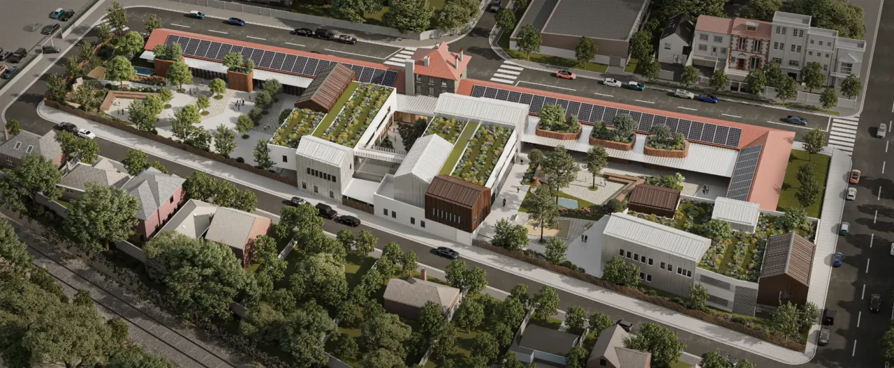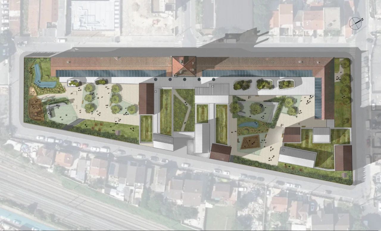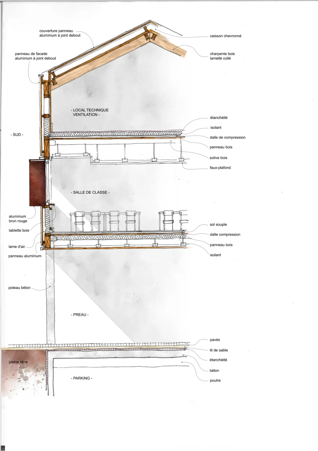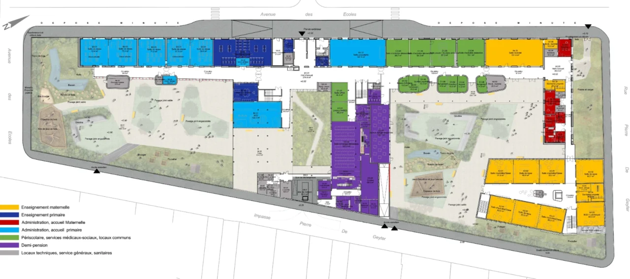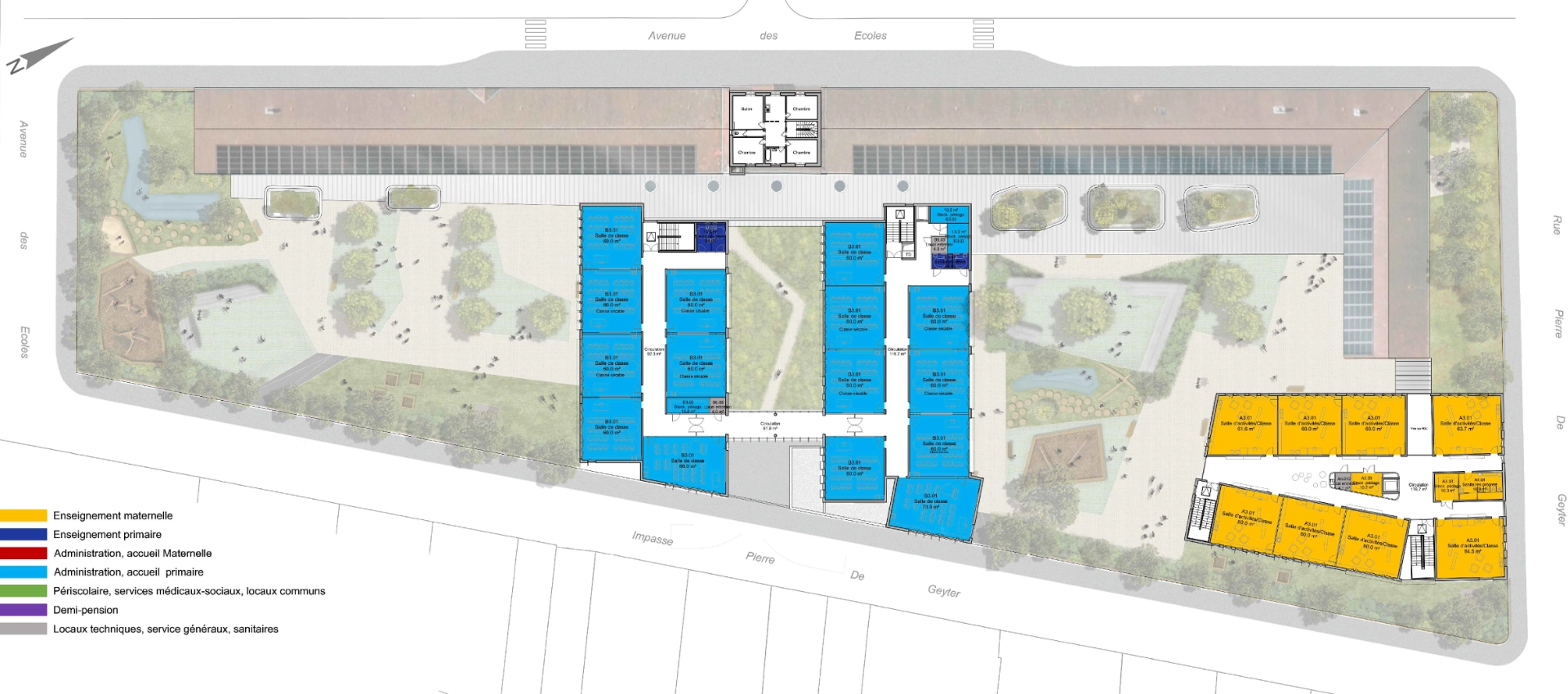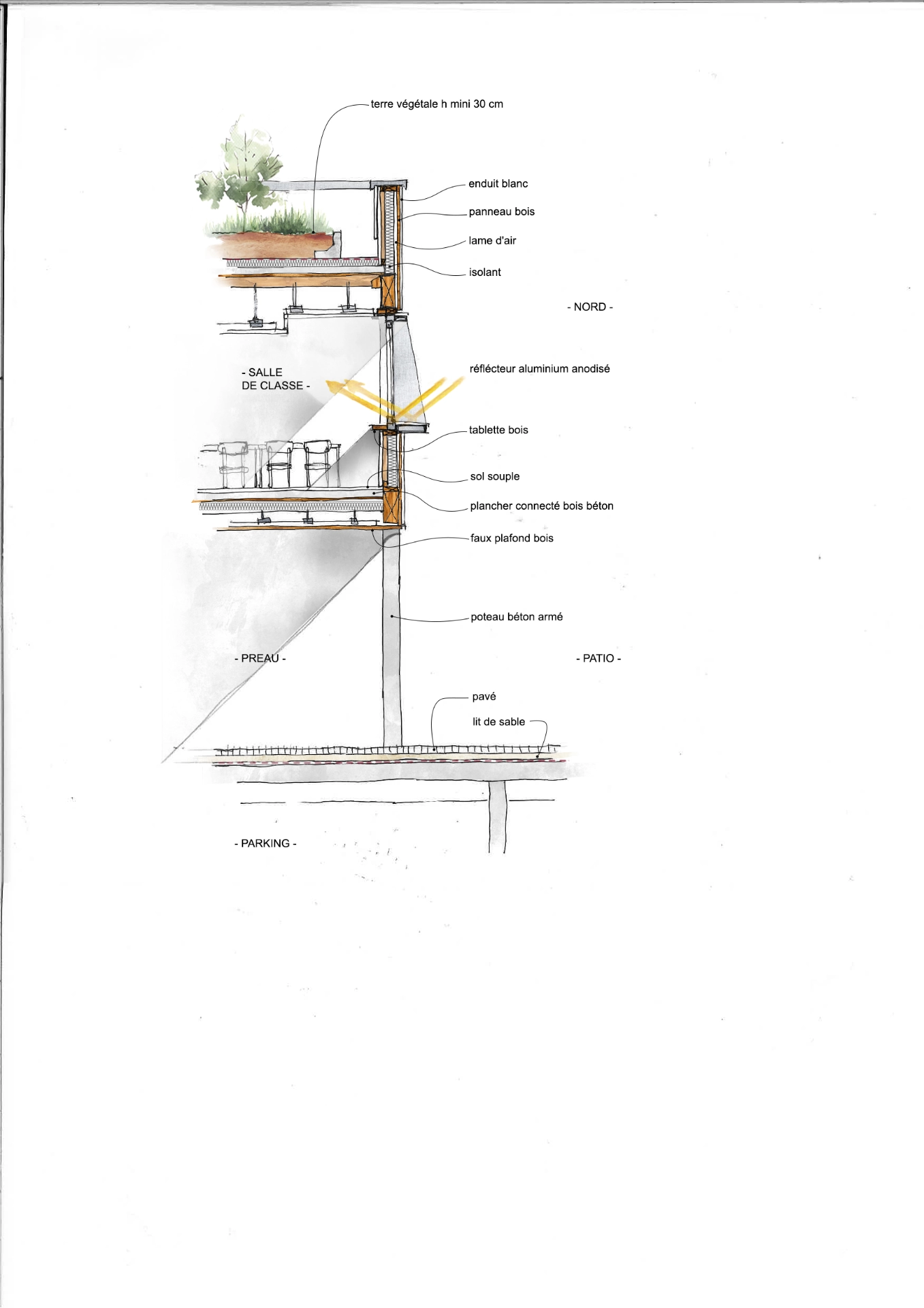 Un volume central, regroupant les espaces communs et de restauration, structure l’ensemble. Il se prolonge par un couloir de distribution indépendant, faisant également office de sas thermique. L’organisation spatiale favorise la lisibilité et la fonctionnalité, dans une approche écologique affirmée. Les deux cours, généreusement végétalisées, s’ouvrent vers la ville depuis la partie sud surélevée du site, assurant une intégration urbaine harmonieuse. Ce projet complexe et concerté incarne la synergie des trois agences, au service d’une architecture sensible et contemporaine.