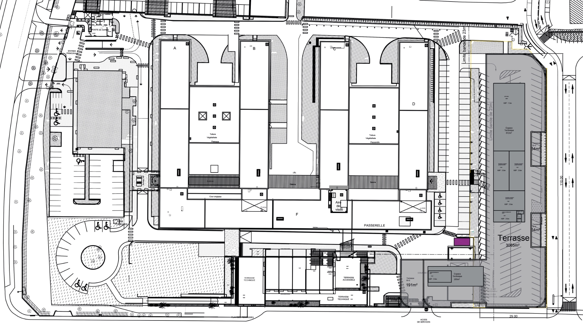 La logistique s’installe au niveau bas. La configuration du site, classé sensible, permet de renforcer la sécurité par un socle opaque en limite de parcelle, combinant panneaux béton et vitrages opaques pour une intégration urbaine soignée.