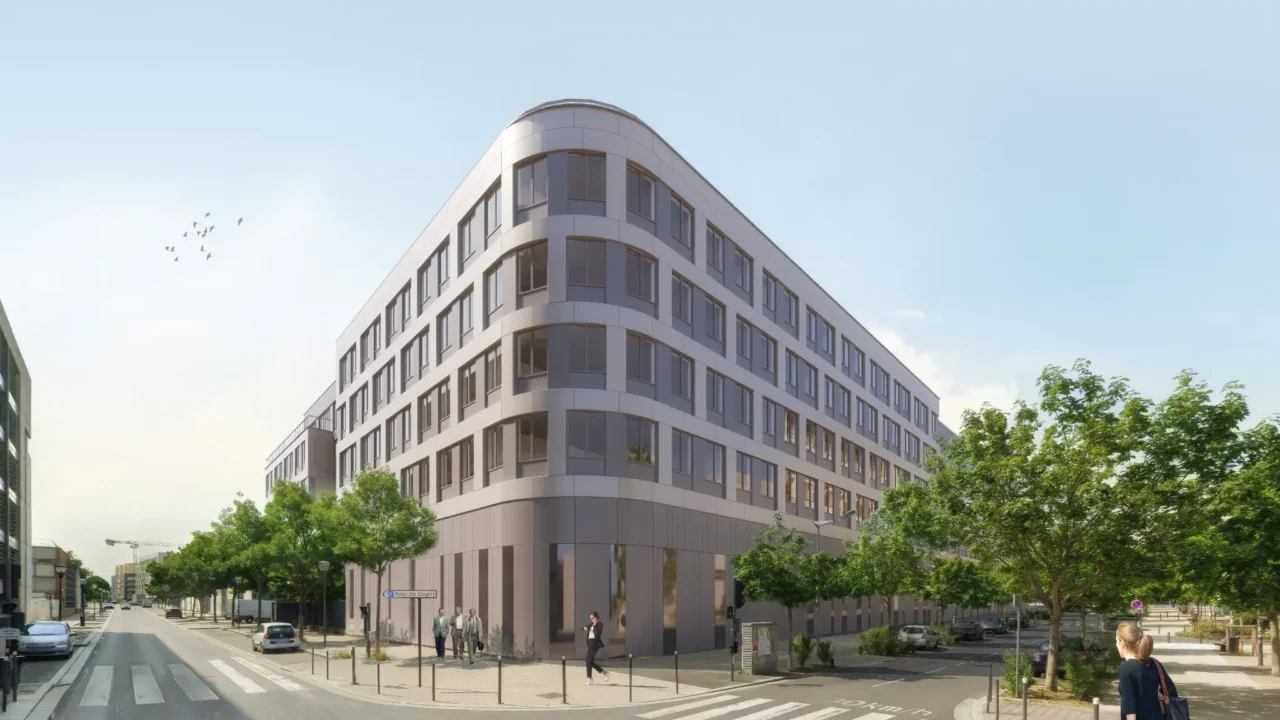 La façade, conçue avec Bouygues, alterne teintes et reliefs dans un motif en quinconce, accompagnant la courbe de la rue et valorisée par la topographie.